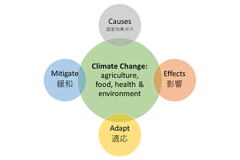 In 「英語農学研究室」we study about climate change causes, effects and countermeasures. Students from different disciplines, such as agricultural science, life science, agricultural chemistry and agri-food & environmental policy, work together to investigate the problems of climate change and potential solutions. They then discuss and explain their work and ideas in English.